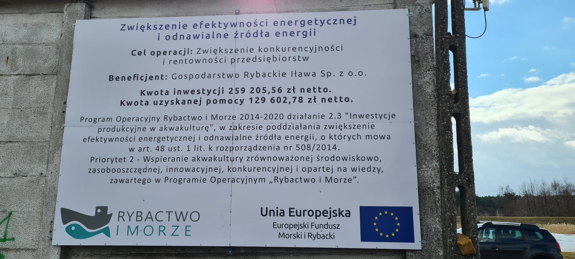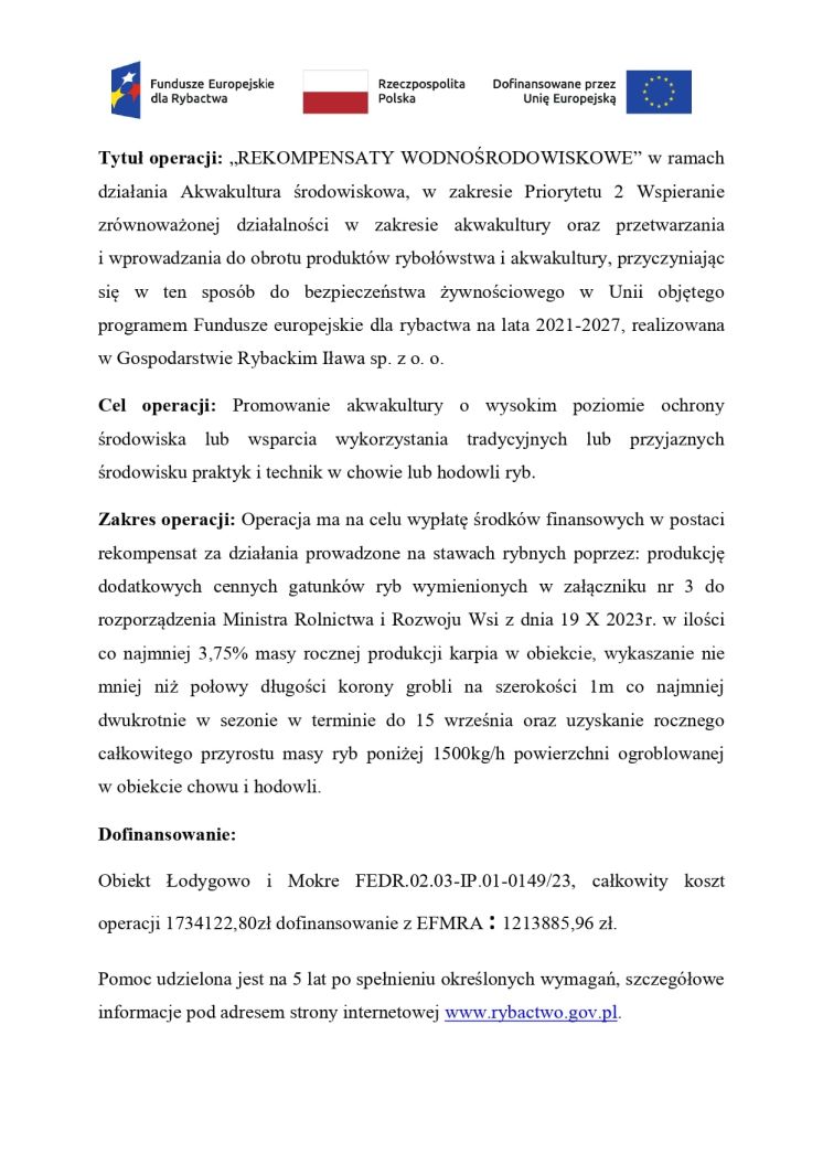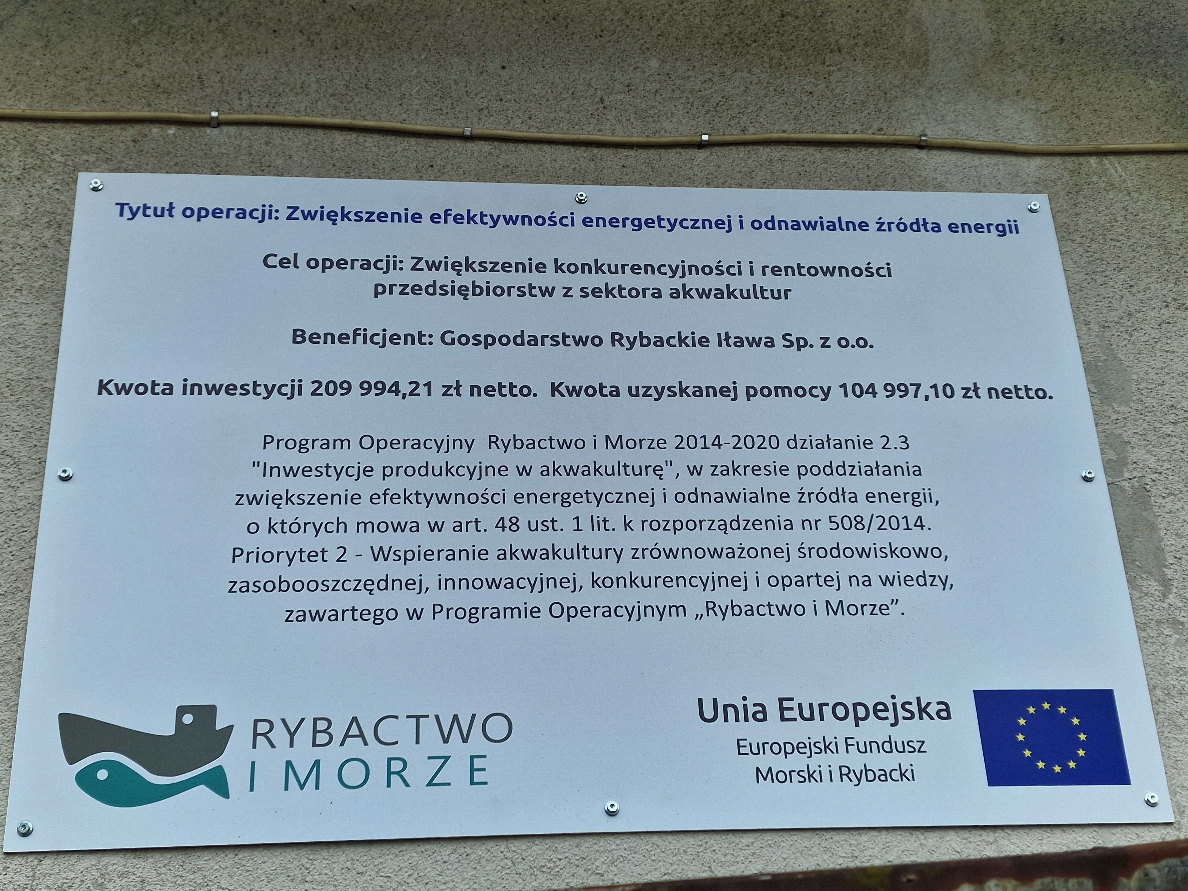 Operacja polegała na budowie instalacji fotowoltaicznej o mocy do 50 kWp oraz modernizację przyłącza energetycznego na bazie w Iławie. Roczne zużycie prądu na bazie w Iławie wacha się na poziomie 85 kWp, dzięki zainstalowaniu małej elektrowni fotowoltaicznej uzyskamy ponad 50 % energii dzięki własnej produkcji co zasili zakłąd MLO oraz zimowy magazyn karpiowy (chłodnie, wędzernia, mrożnie, pompy, natlenianie). Wartość kosztorysowa budowy 209 994,21 zł netto, + Vat. Całkowity koszt operacji to 209 994,21 zł netto + VAT.